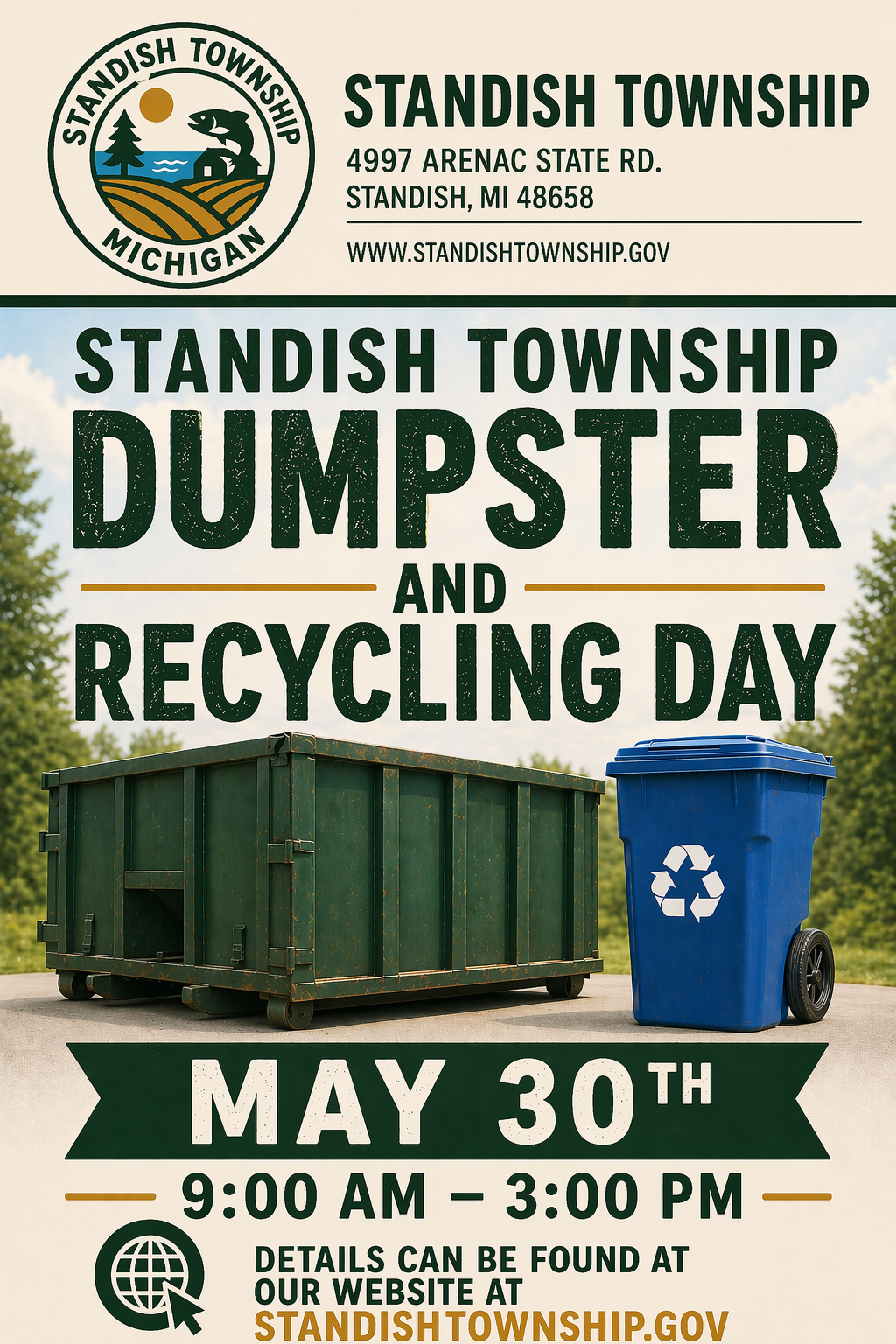 Standish Township is hosting a community Dumpster & Recycling Day for residents and property owners on May 30, 2026, from 9:00 a.m. to 3:00 p.m. at the Township Hall (4997 Arenac State Road). Residents are welcome to bring acceptable household items for disposal. The Township is partnering with the Arenac Conservation District to also provide recycling services during the event. Please note that some materials are not accepted and certain items may require a small fee. A full list of accepted items and fees is included below.